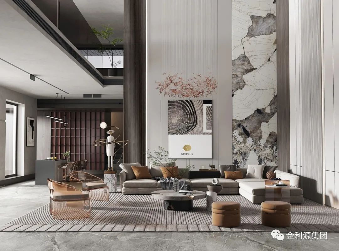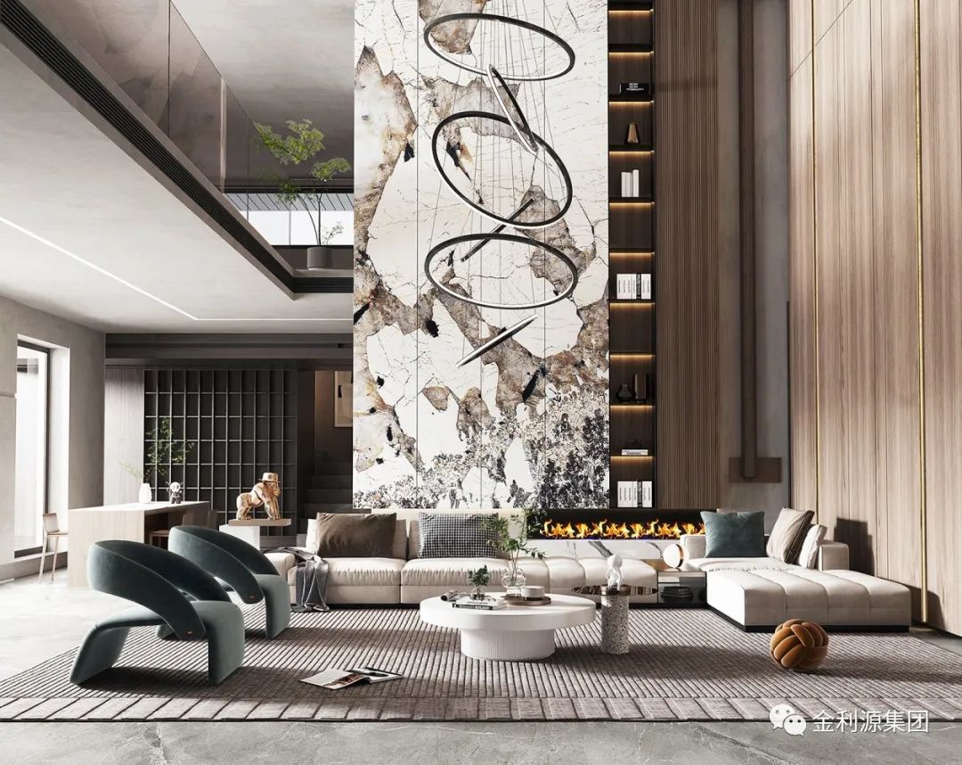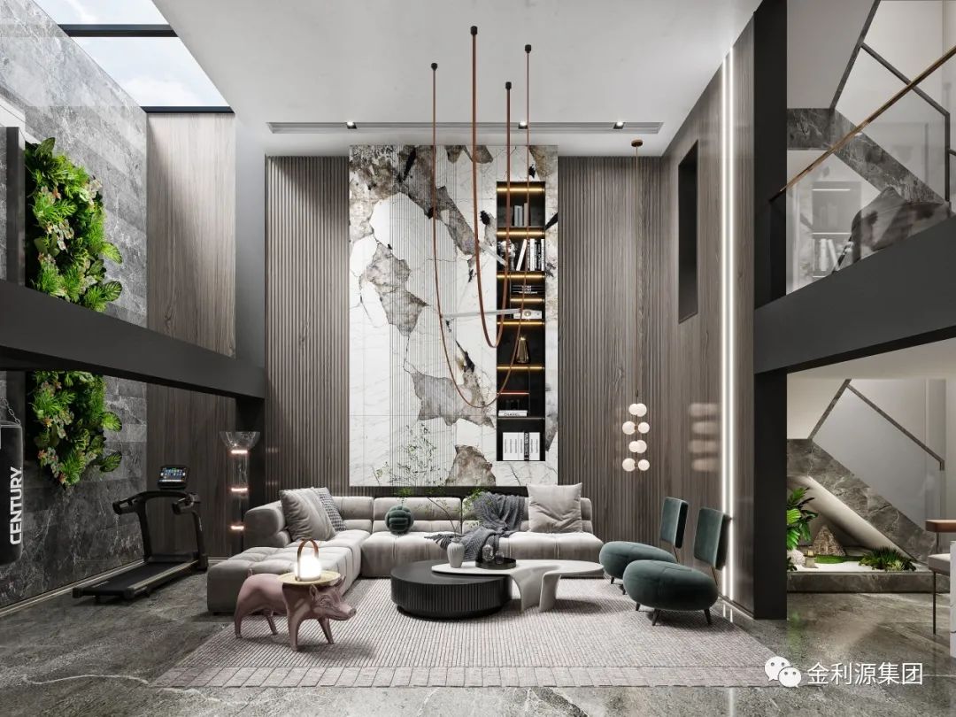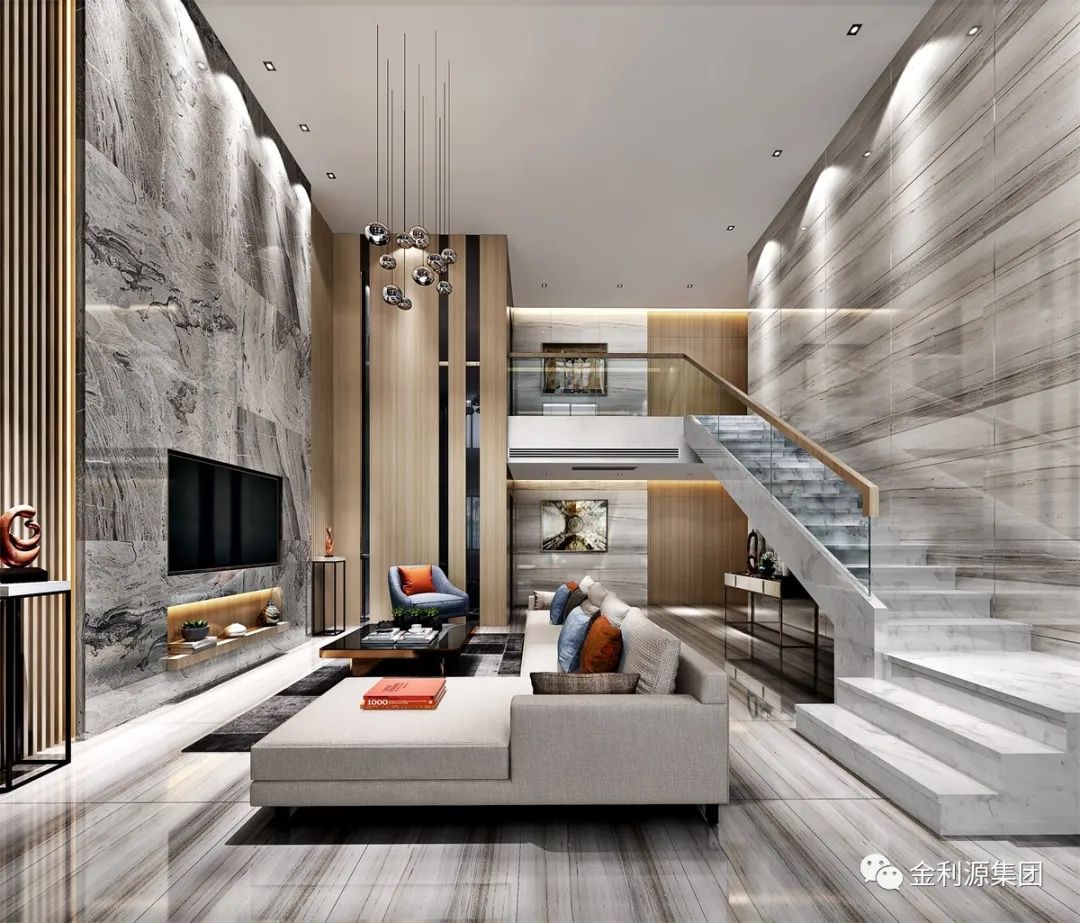 挑空的墻面一般都會(huì)設(shè)置一面大大的電視背景墻,這面背景墻一定要做到頂,這樣才能保證空間的整體感和高質(zhì)感。