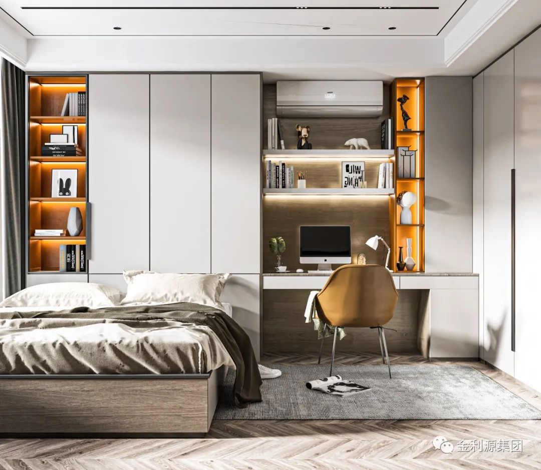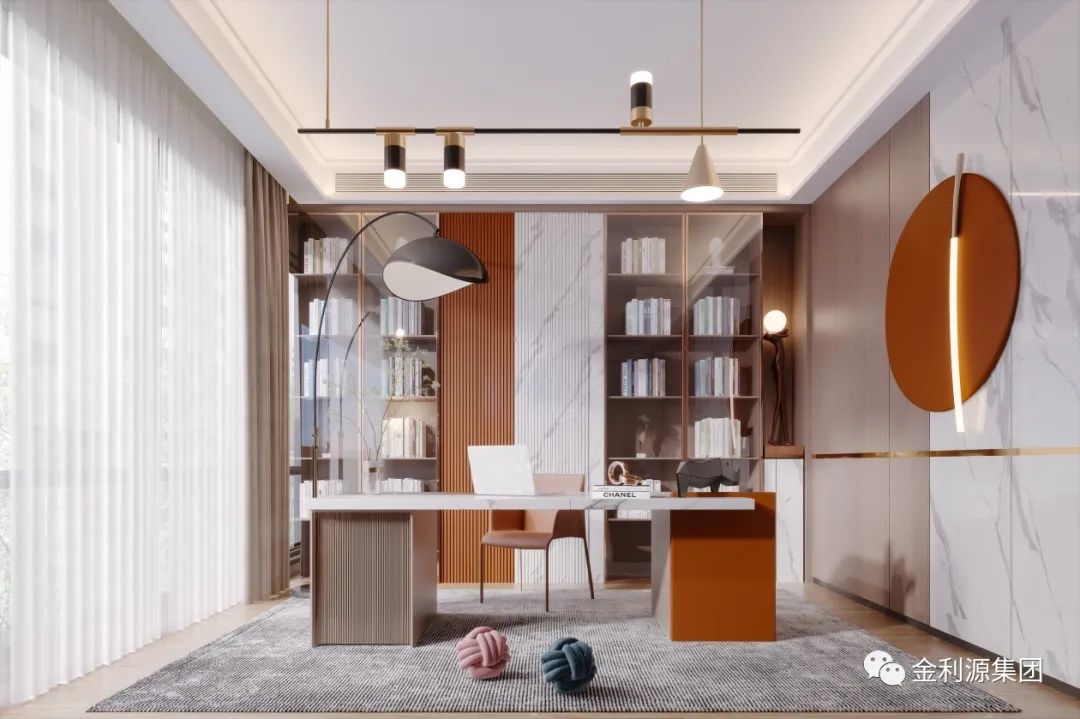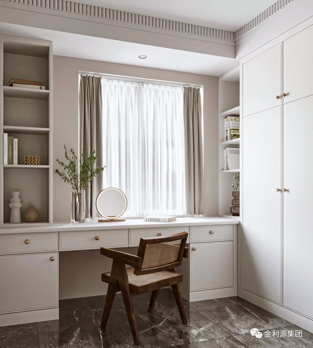 靠窗定制木質(zhì)書(shū)桌,溫潤(rùn)輕盈的木飾面,動(dòng)線(xiàn)流暢,舒適且治愈。透過(guò)光線(xiàn)的牽引,和緩繾綣的暖陽(yáng)伴著溫?zé)岬奈L(fēng)入室,仿佛令一切都慢了下來(lái),時(shí)光如春雨潤(rùn)物般地充實(shí)著自己的心靈。
