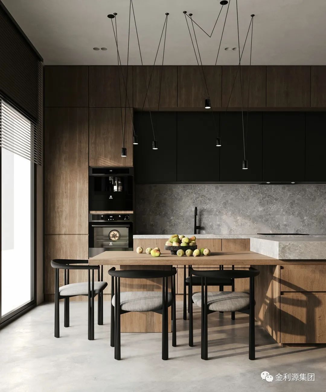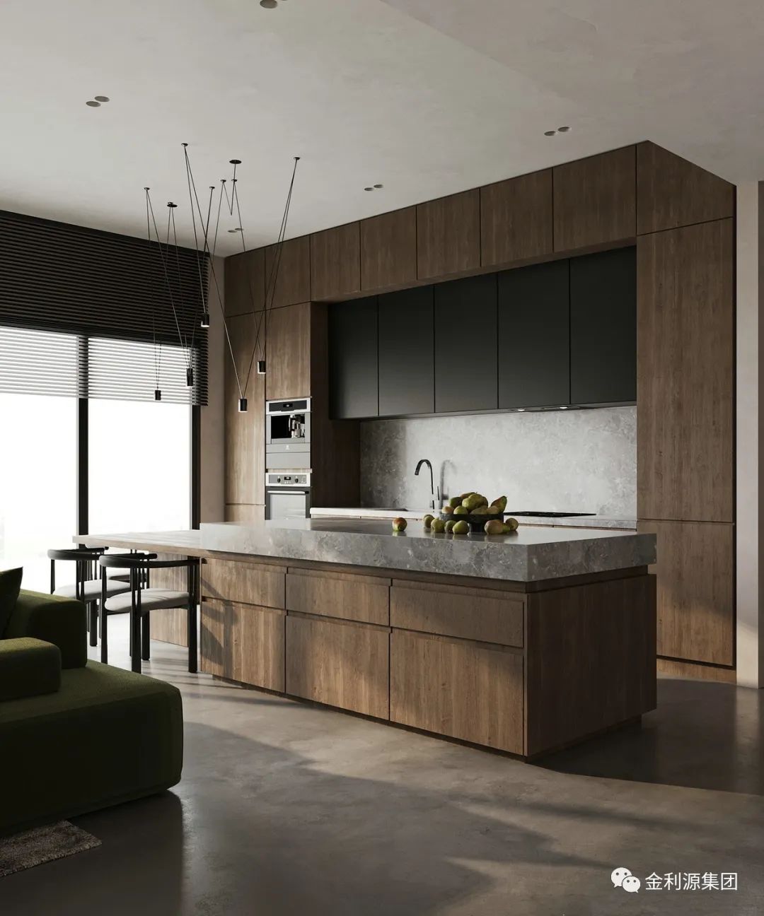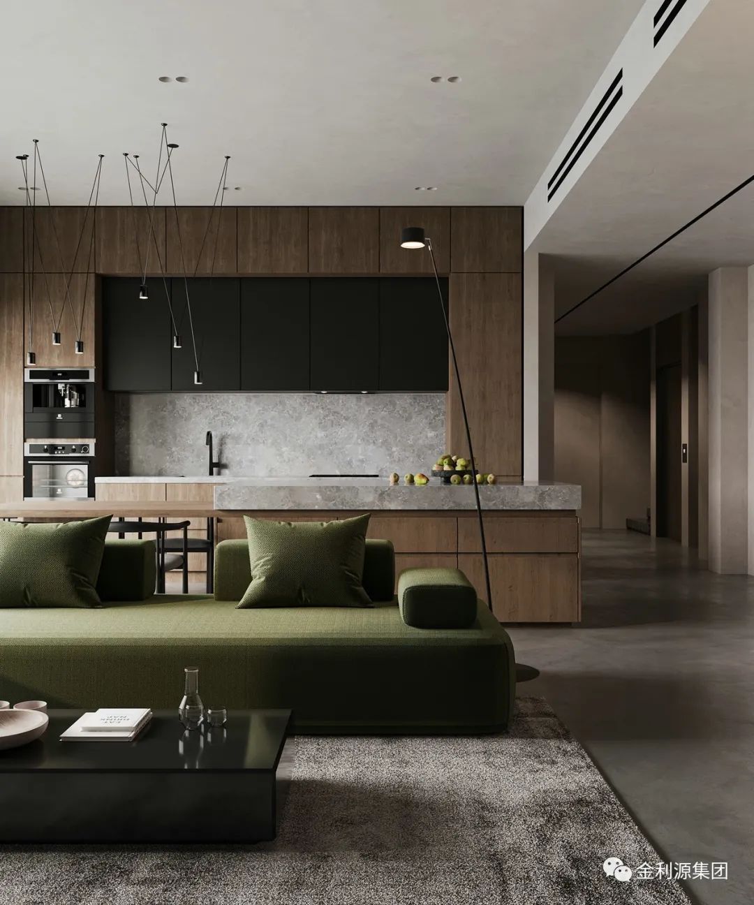 廚房位于休息區(qū)的一側(cè),櫥柜與島臺同樣使用原木與黑色配色,櫥柜下方散發(fā)出燈光,為空間增添暖意的同時拉闊了視覺的延伸感。生態(tài)板—金利源板材