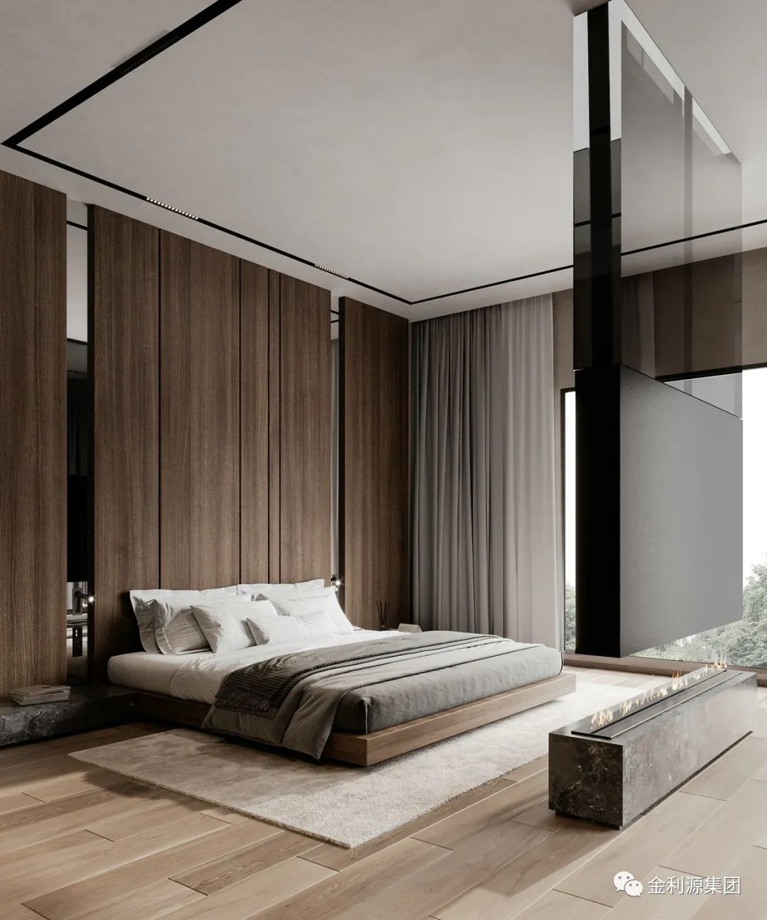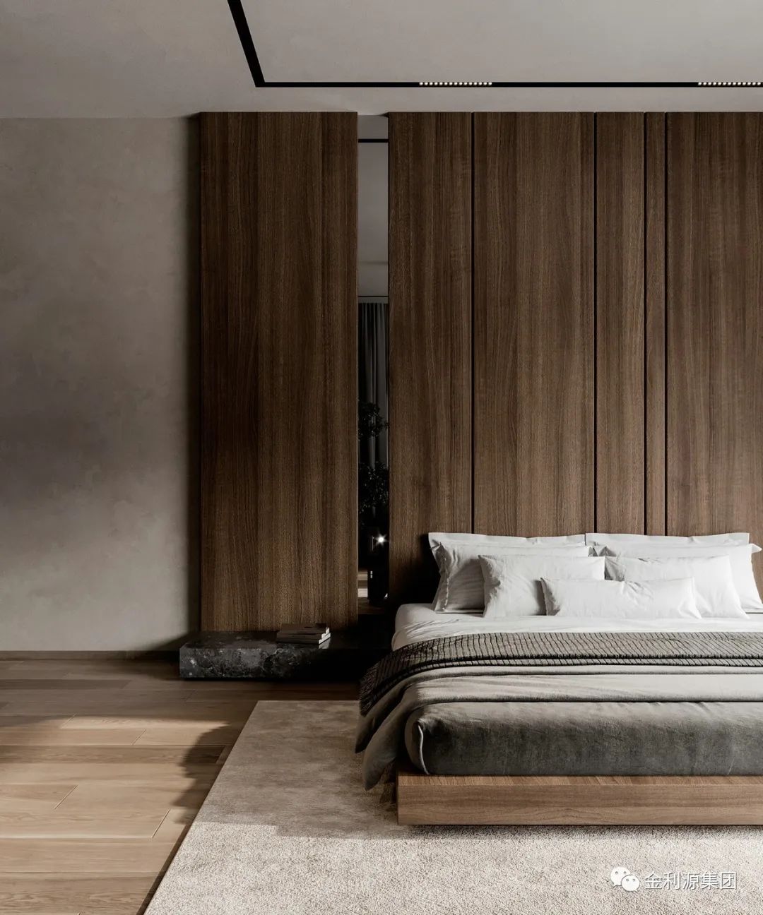 主臥沒有復(fù)雜的設(shè)計,簡簡單單的線條營造美感與遐想。步入式衣帽間的設(shè)計,將收納能力做到最大化。背景墻用木飾面與黑色搭配為主,時尚又不失質(zhì)感。板材品牌有哪些—金利源板材
