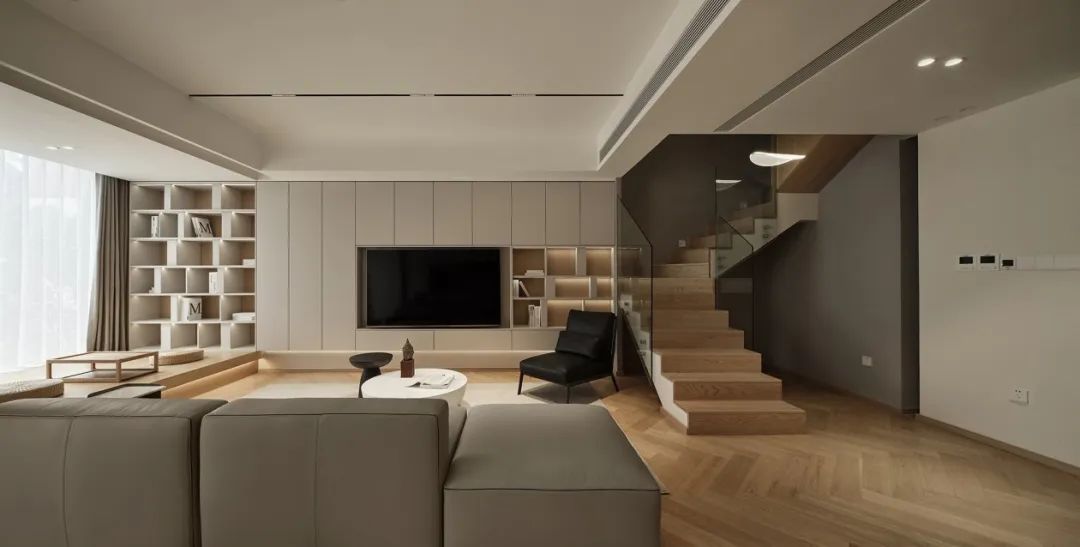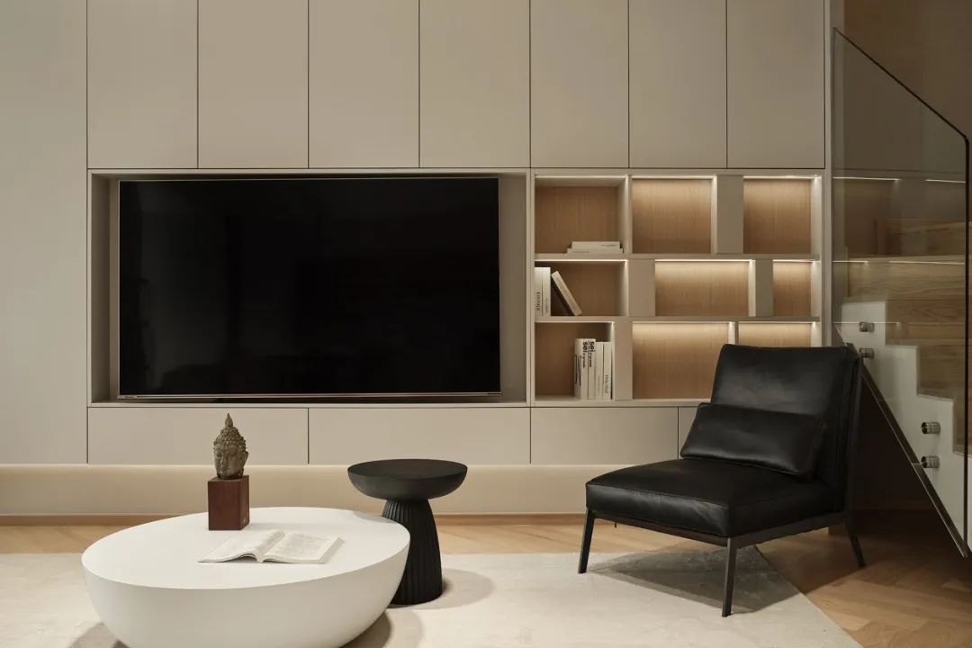 賦予空間敘事更強的光影美感,在體塊合圍之下促成空間的交互,增強了一域多用的可能性,拓展自由感的視覺表達與空間呈現(xiàn)。將科學(xué)性與美學(xué)性融入電視背景墻,展露一重一輕、一簡一繁的設(shè)計思想。