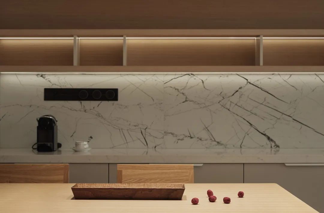 利落的轉(zhuǎn)折,統(tǒng)一的配色,相輔相成,巧妙的削弱空間的擁擠感,包容烹煮習(xí)慣,極致簡約,便利實用。