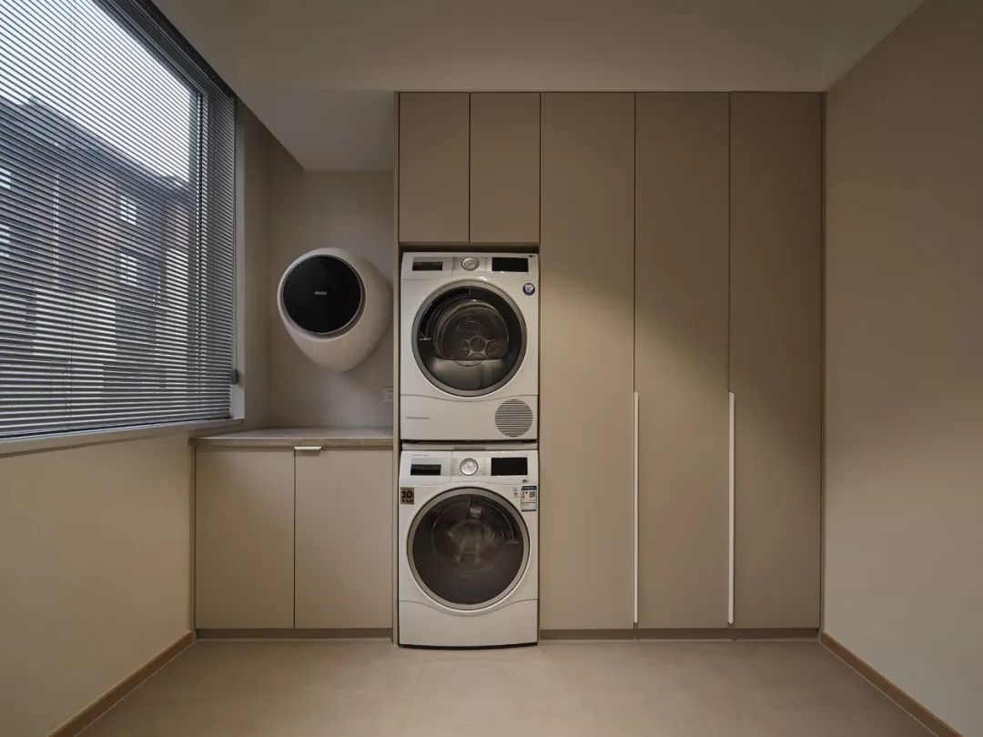 根據(jù)空間尺度與電器造型,塑造集收納、擺置、清洗、烘干、晾曬于一體的洗衣房,采用中性色維穩(wěn)整體氣質(zhì)。全屋定制板材—金利源板材