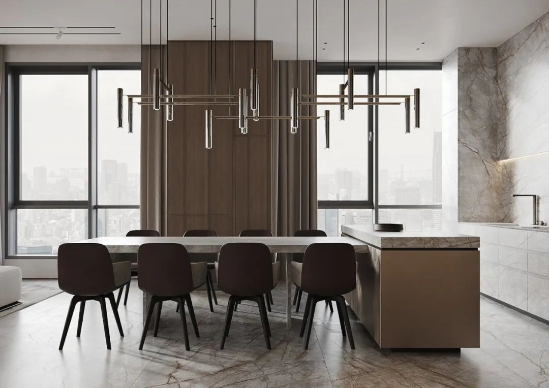餐廳與客廳空間,目之所及的家居設(shè)計(jì),選用彼此呼應(yīng)的雅典酸枝花色。金色金屬線穿插其間,更顯輕奢典雅。