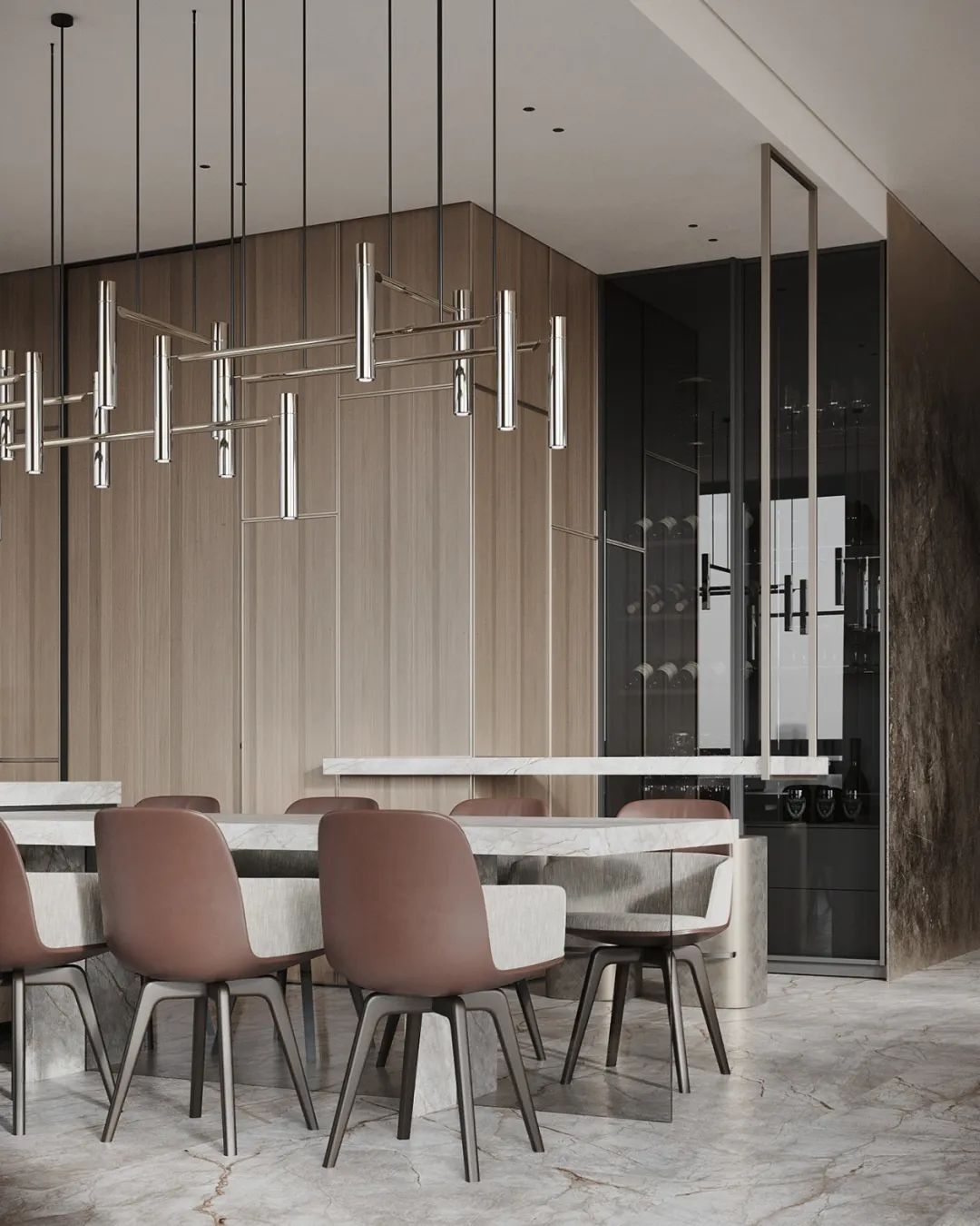 直紋金像花色的應(yīng)用,增加了大自然的儀式感。原木背景墻襯托下,美的不僅是風(fēng)格,更是生活。