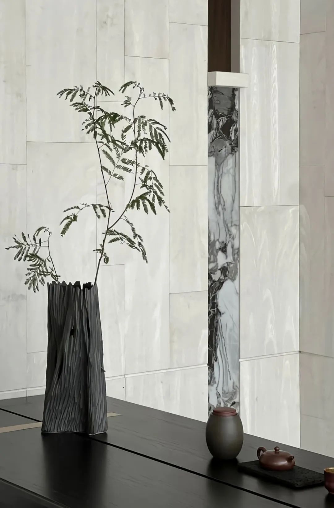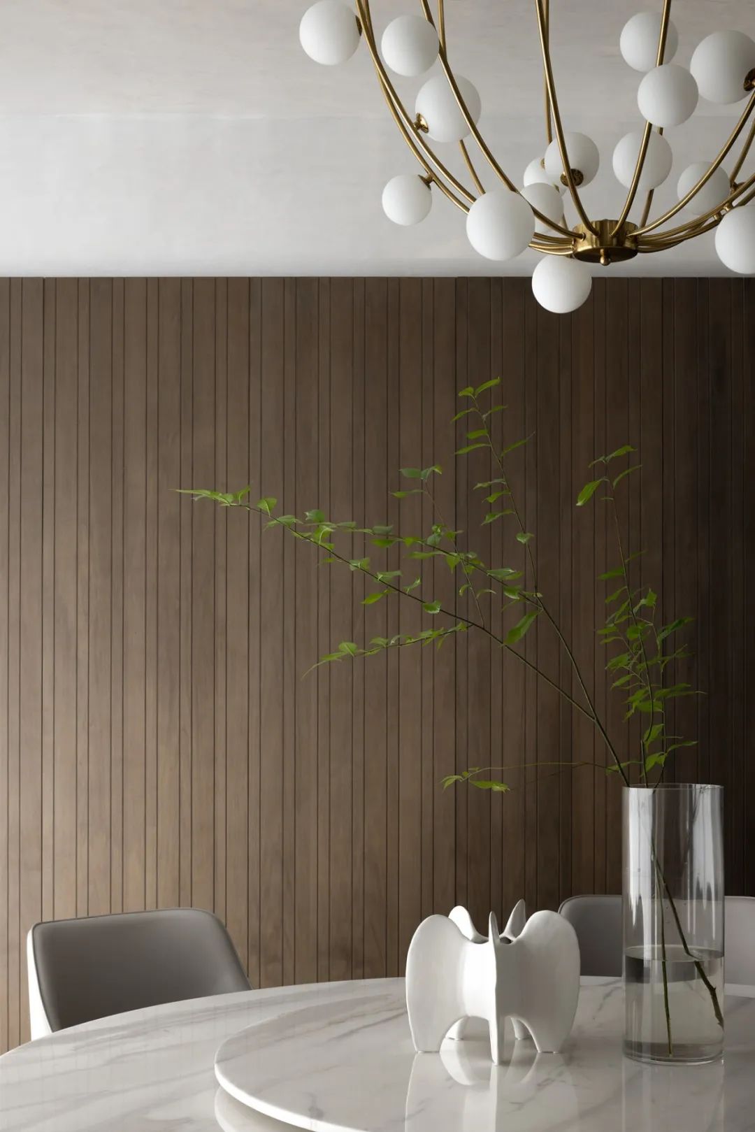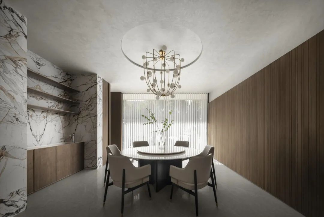 向內(nèi)探尋,空間的再界定變得主次有序、動(dòng)靜相隔。餐廳以圍合、四向的縱深感無(wú)形劃分界限,咫尺之間的意象,花紋大理石墻壁透出若有似無(wú)的邊界,予人流動(dòng)輕盈、詩(shī)意蕩漾的想象。