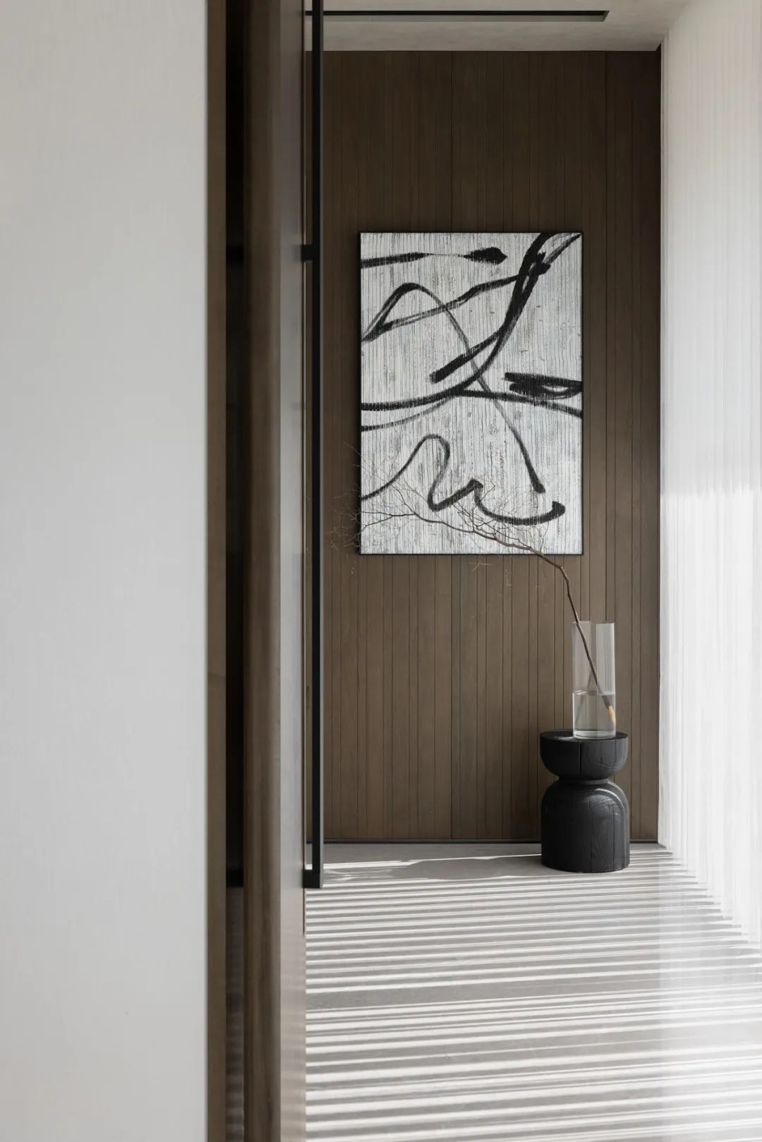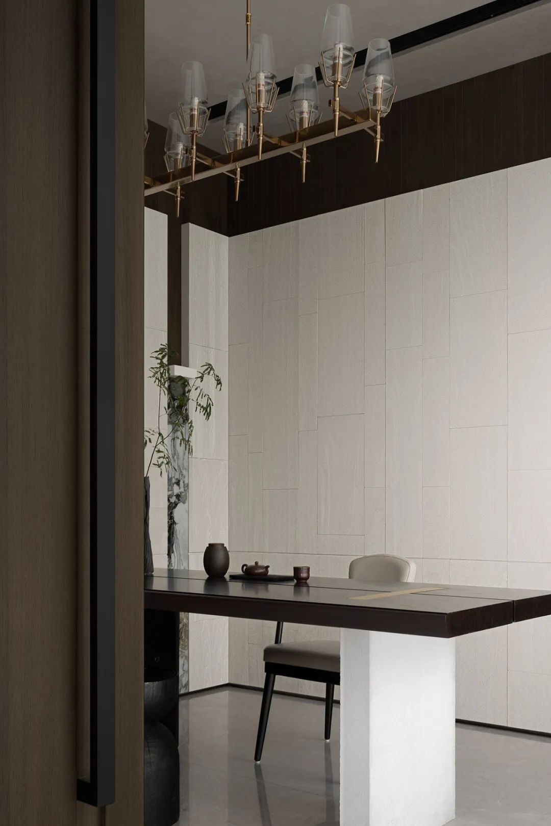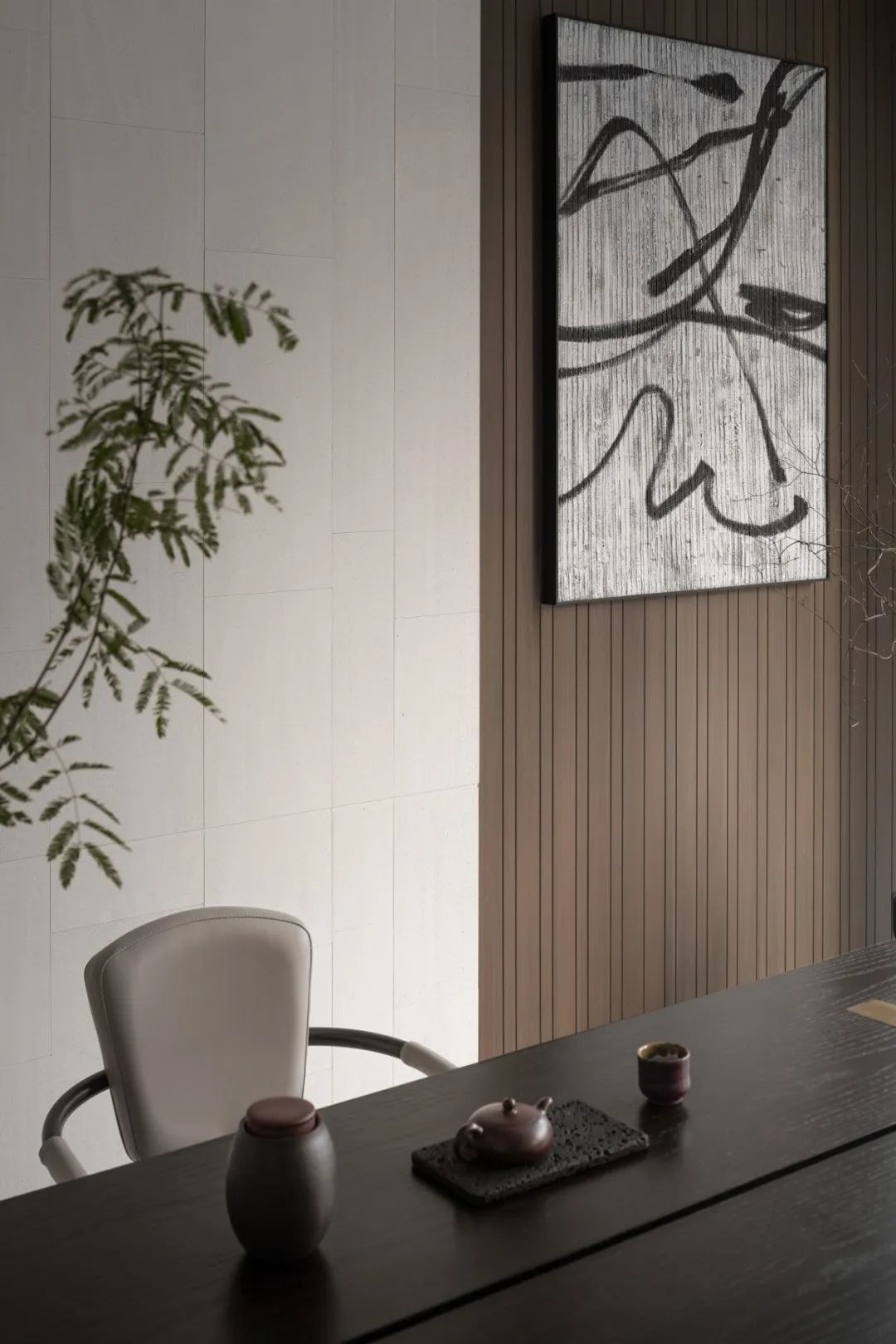深處,茶室將明朗的優(yōu)雅與質(zhì)樸的素靜奠定空間的基調(diào),一筆凌亂的水墨畫(huà),將空間克制的審美臆想打亂,自然的人文氣質(zhì)瞬間在空間中鋪開(kāi)。