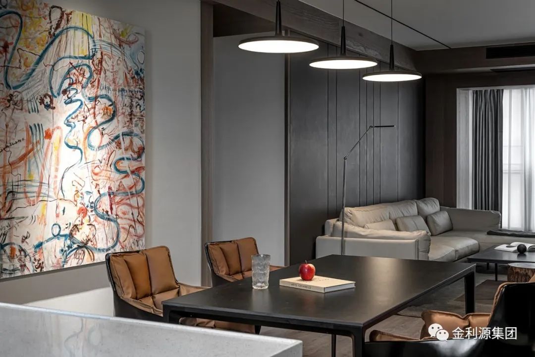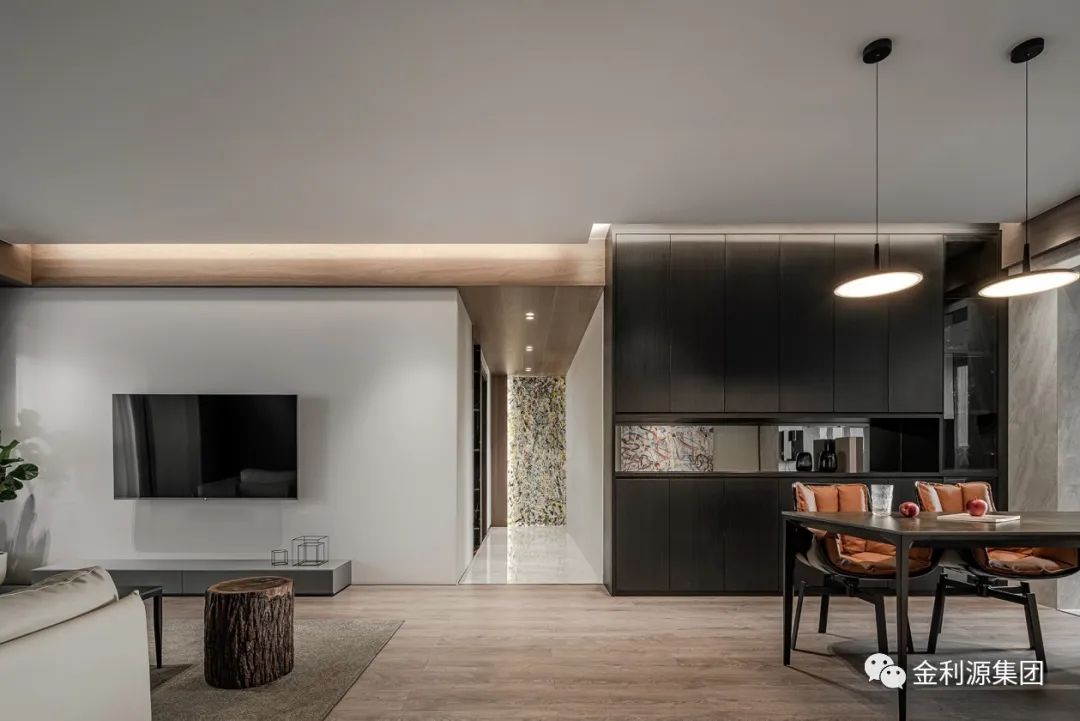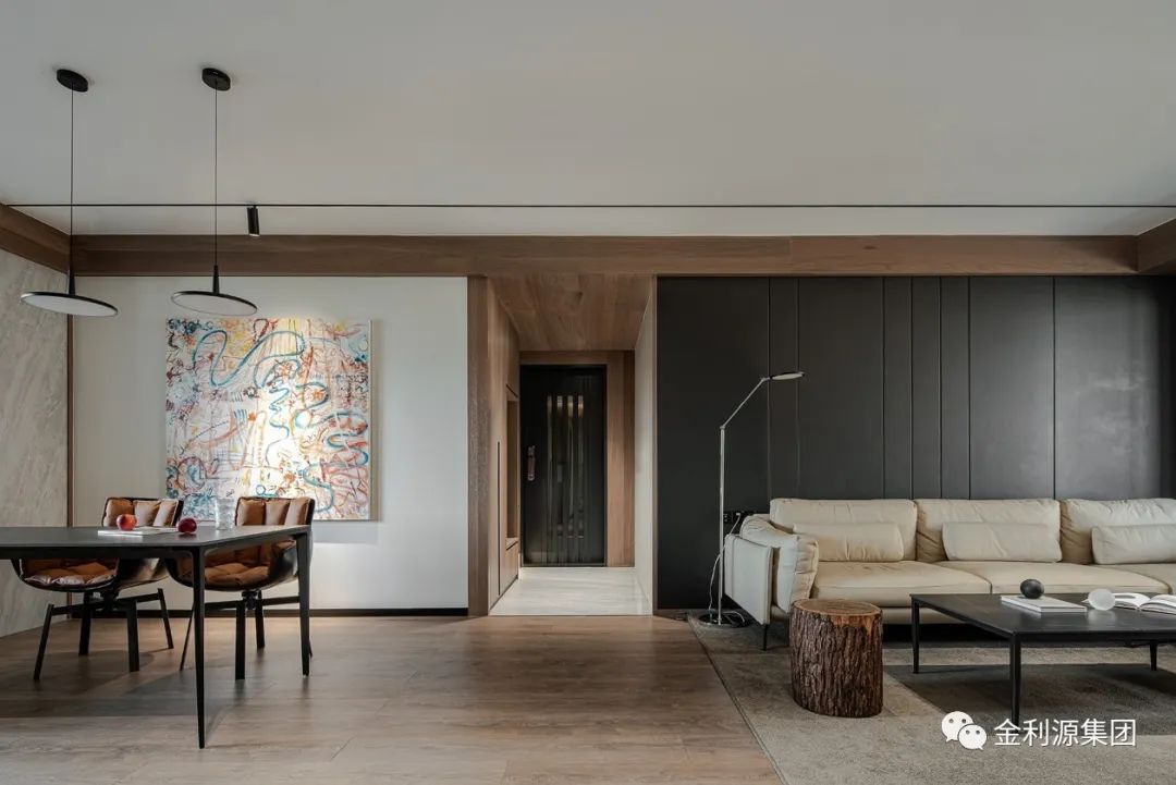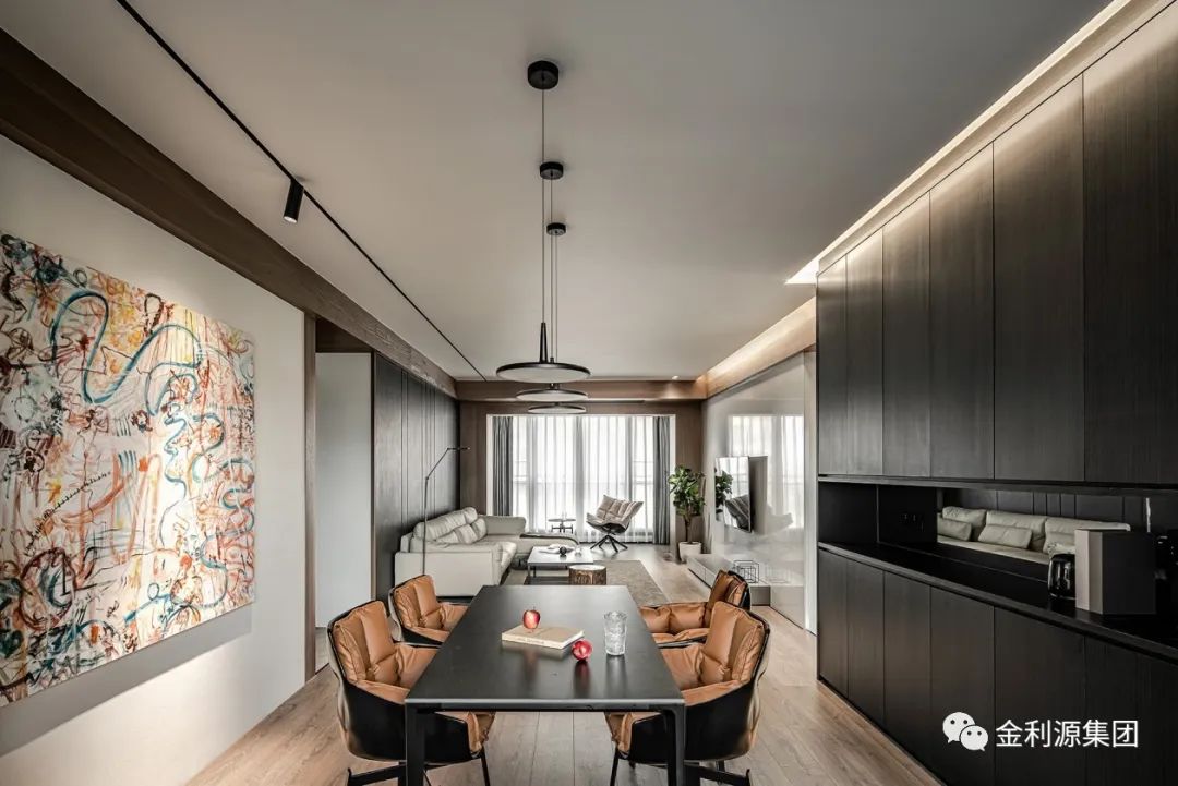 以暖木色鋪陳整體底蘊,勾勒墻體與梁體,為規(guī)整領(lǐng)域架構(gòu)穩(wěn)固根基。黑色手工漆涂抹沙發(fā)硬包背景,呼應(yīng)黑色極簡巖板茶幾,散發(fā)安然氣息。