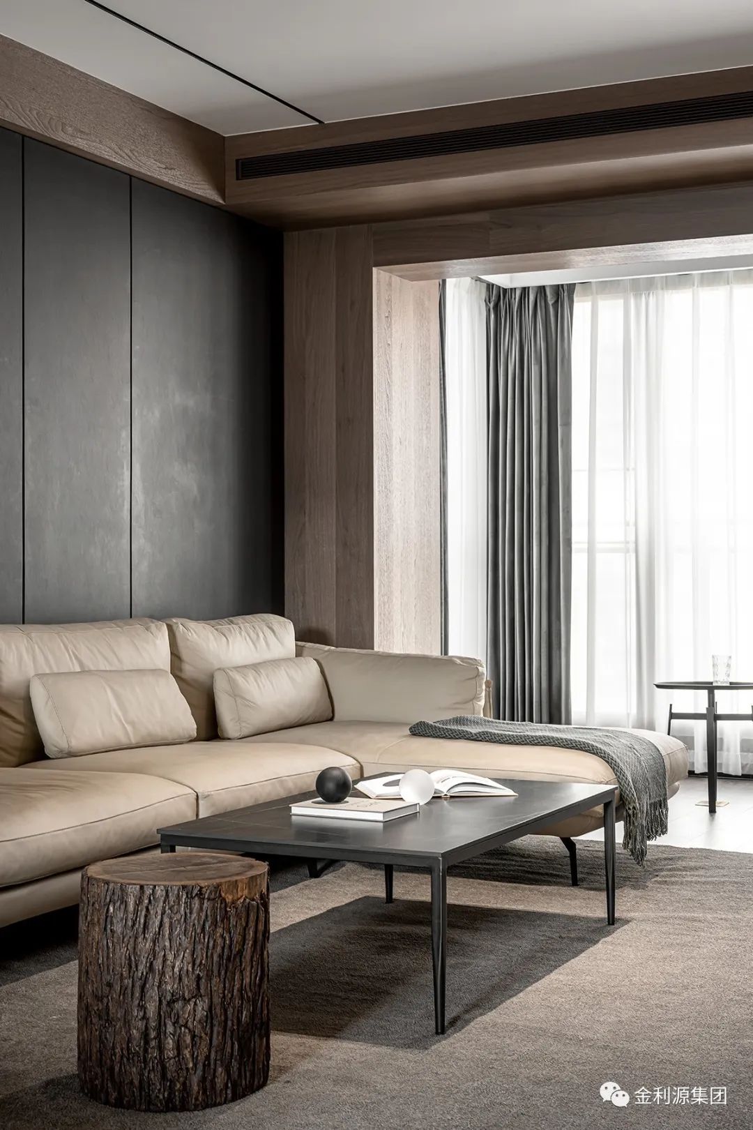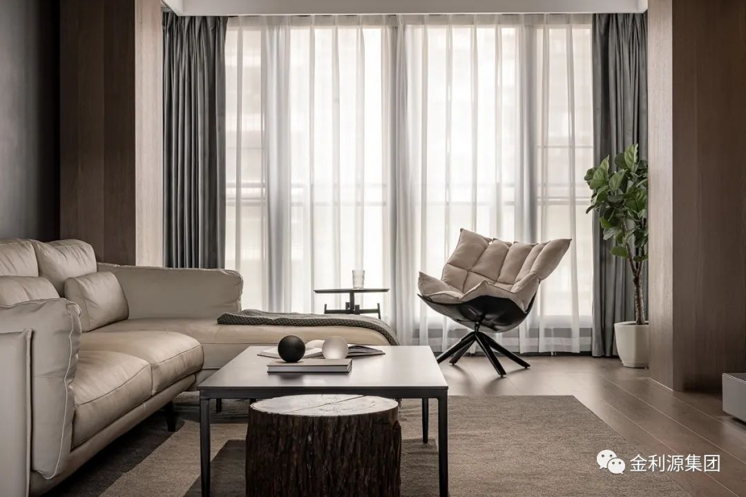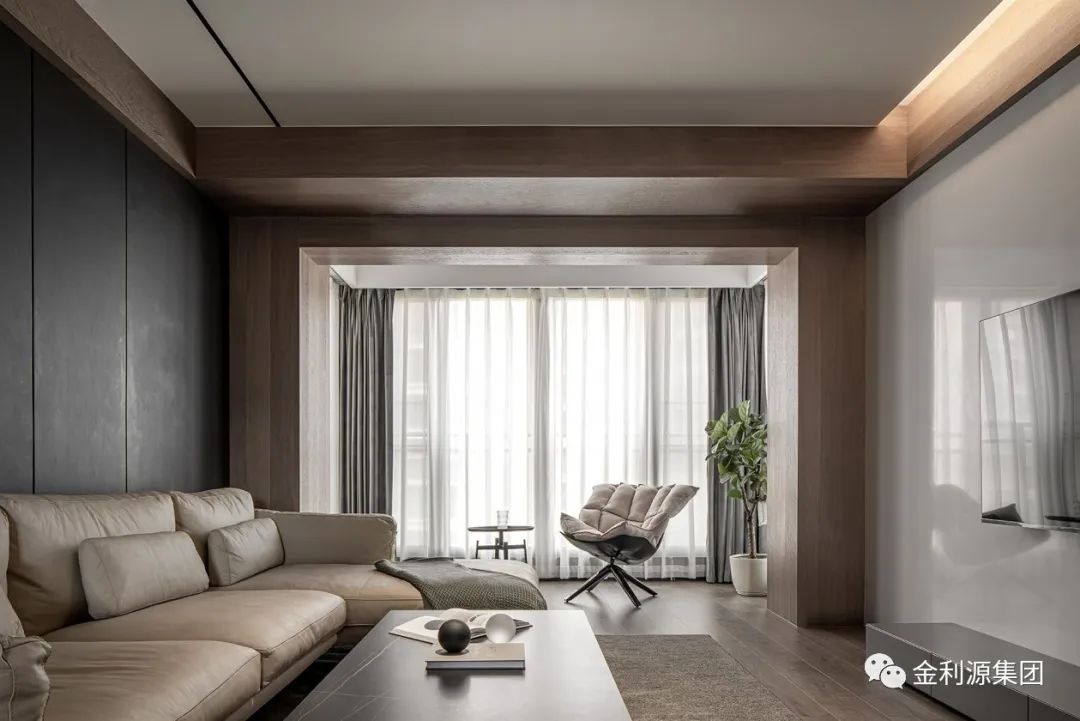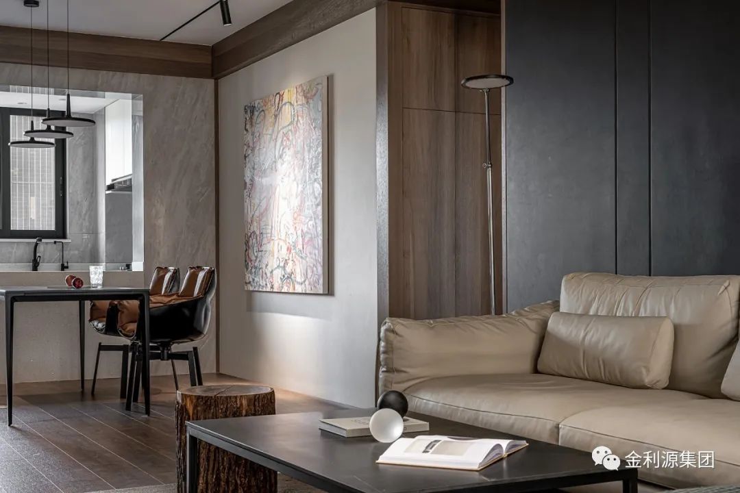 以暖木色鋪陳整體底蘊,勾勒墻體與梁體,為規(guī)整領(lǐng)域架構(gòu)穩(wěn)固根基。黑色手工漆涂抹沙發(fā)硬包背景,呼應(yīng)黑色極簡巖板茶幾,散發(fā)安然氣息。