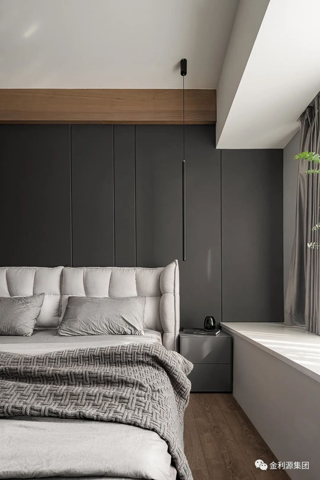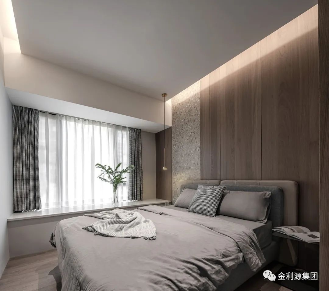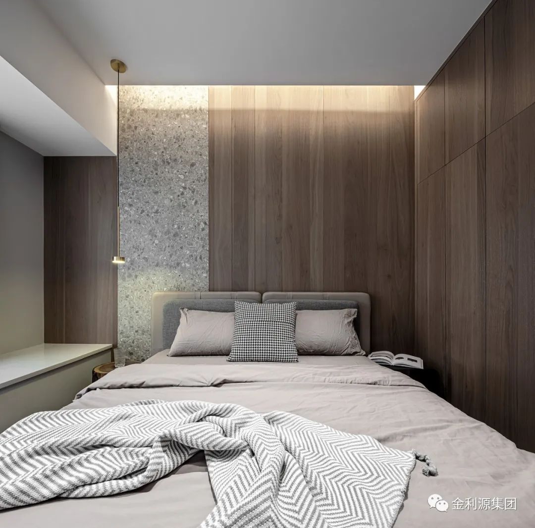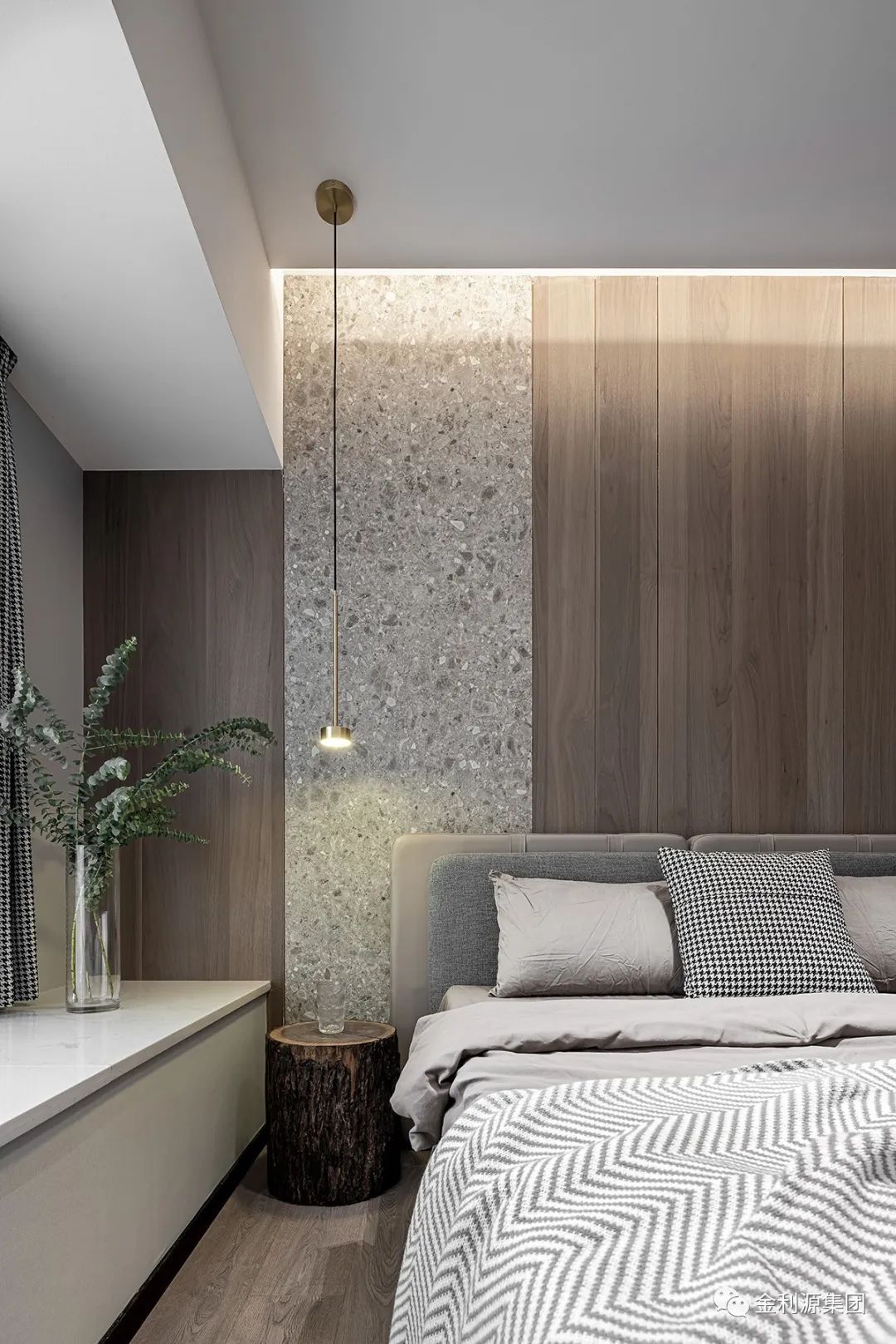 簡約金屬吊燈明亮床頭木樁,裝點綠植鮮活功能區(qū),多元材質(zhì)渾然合體,以自然調(diào)性凝聚安逸…