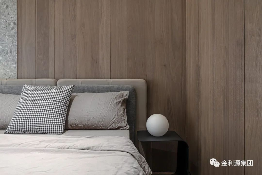延續(xù)整體配色,平衡一素一暖簡約風(fēng)格。素白布藝床體選配純黑床頭柜,制造錯覺忽略物件存在感,拓寬空間尺度,從外向內(nèi)傳遞通透,迎光而居。