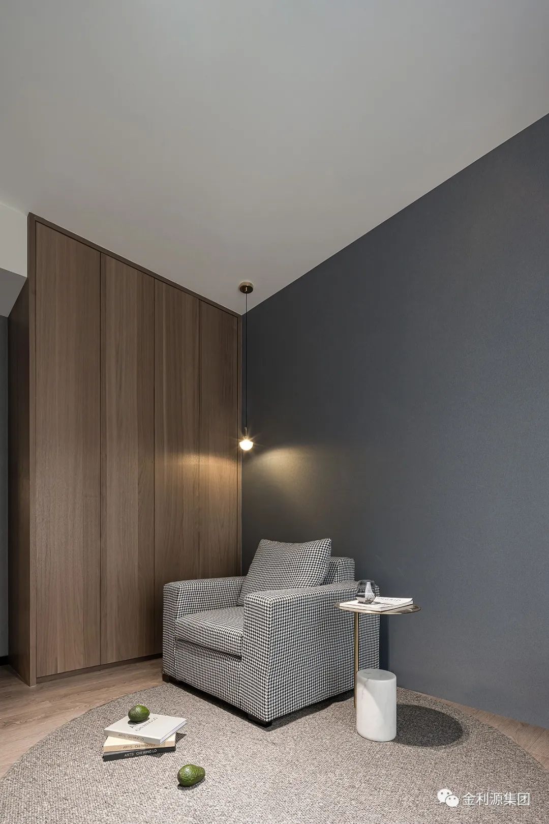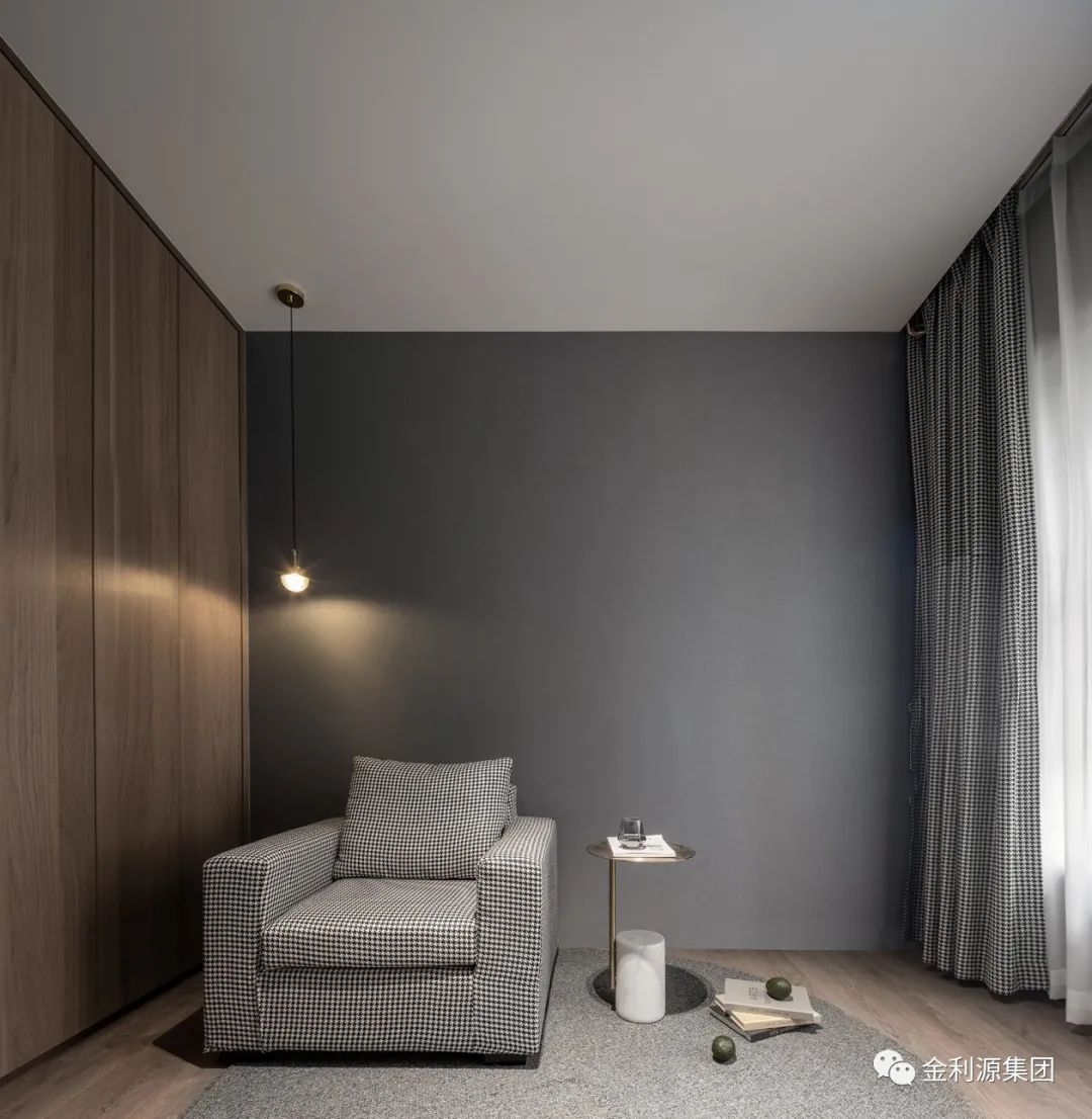 深灰硬包背景對立白色柜體,延續(xù)整體簡潔設(shè)計,以經(jīng)典配色流動功能區(qū)布局…