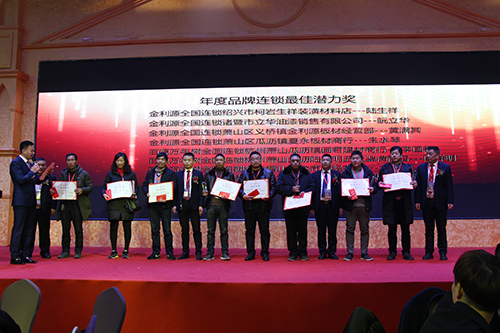 2017年金利源取得了輝煌的成績,成績的背后離不開所有金利源家人們的共同努力。在會議現場,金利源現場表彰了2017年表現優(yōu)秀的員工。首先頒發(fā)的是年度品牌連鎖最佳潛力獎.