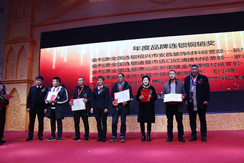 年度品牌連鎖銅銷獎:金利源全國連鎖紹興市安昌裝飾材料經營部阮華東、諸暨市店口欣浦建材經營部羅志偉、蕭山區(qū)新街鎮(zhèn)金利源板材經營部陳月堅、諸暨市振越裝飾超市趙小明;萬年樹全國連鎖杭州蕭山木色天國裝飾材料經營部王海軍。